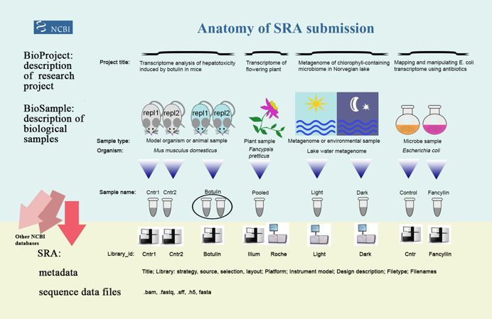 有過數(shù)據(jù)上傳經(jīng)歷的童鞋應(yīng)該對SRA并不陌生,上傳數(shù)據(jù)前我們一般要創(chuàng)建BioProject、BioSample,用于詳細(xì)說明項目信息、樣品信息;并通過SRA的Experiment、RUN描述建庫測序相關(guān)信息,如建庫類型、測序儀器、單雙端等;下圖概括出了幾者之間的關(guān)系。