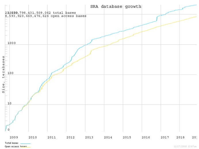 SRA數(shù)據(jù)庫中存儲的是高度壓縮后的sra格式數(shù)據(jù),截止到目前,SRA中已經(jīng)累計存儲了超過20P堿基數(shù)據(jù),而且每年仍在以極快的速度增長。