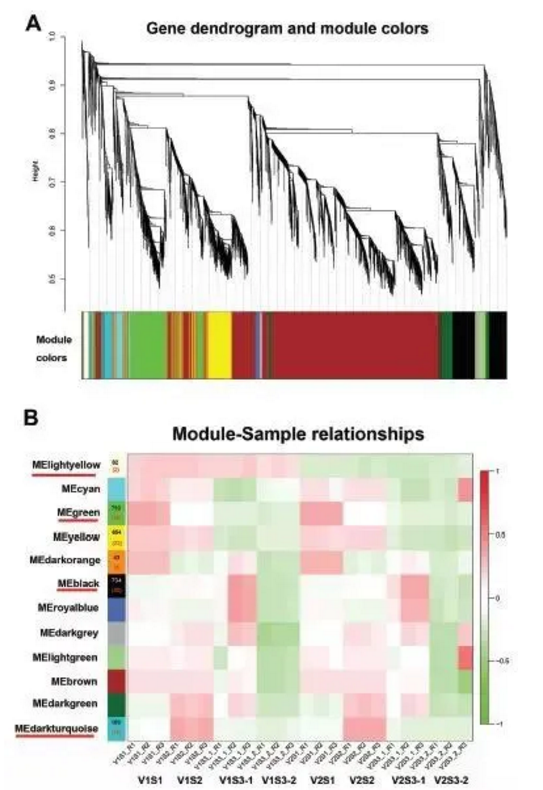 然后作者利用高分文章利器:WGCNA分析,進行數據深度挖掘和整理,推薦大家使用百邁客云平臺小工具WGCNA模塊,可以出來和作者同樣高大上的圖片。