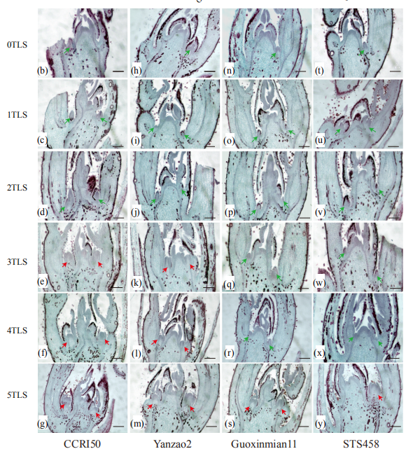陸地棉(Gossypium hirsutum L.)是世界上最重要的纖維作物。在我國黃河流域和長江流域棉區(qū),實現早熟棉在小麥或者油菜后直播可以提高復種指數。而在西北內陸棉區(qū),春季氣溫低,秋季枯霜早,早熟棉既能提高棉花的霜前花率,還可以改善棉花品質?;ㄑ糠只怯绊懚碳久奁贩N早熟的重要性狀,是棉花現蕾期、開花期和成鈴期發(fā)育的基礎,花芽分化直接影響開花時間。花芽分化是植物從營養(yǎng)生長向生殖生長過渡的標志。當進入生殖生長時,側芽變成花芽,花芽發(fā)育成果枝。果枝分化決定了開花量、生殖能力和棉花產量。因此,早熟性狀及早熟棉品種在生產上顯得尤為重要。
