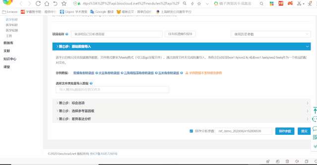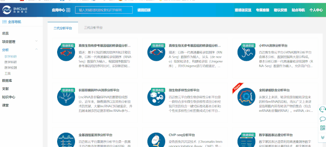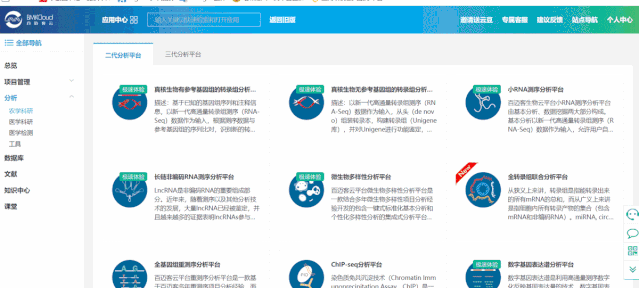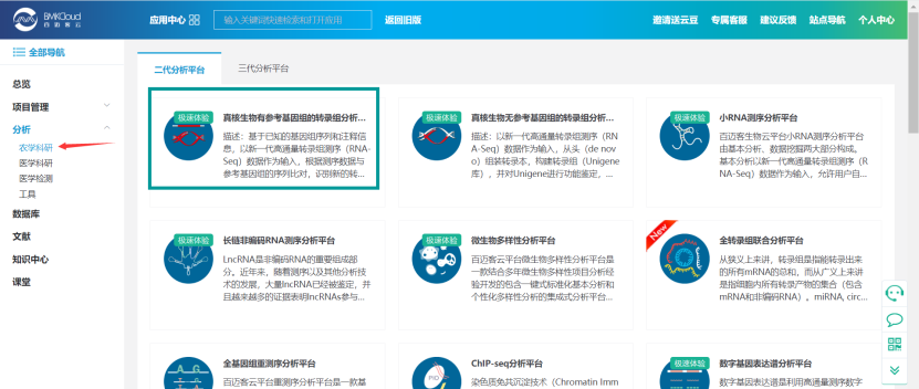 百邁客云包含農學和醫(yī)學兩大類分析平臺,醫(yī)學分析平臺主要針對人、鼠數據的分析,包含:轉錄組、非編碼RNA、單基因病外顯子、腫瘤外顯子、重測序等數據分析,以及全轉錄組聯合分析;農學分析平臺可以應用到更多的物種,涵蓋轉錄組、非編碼RNA、微生物、蛋白、代謝等數據的分析,以及全轉錄組聯合分析等。點擊左側導航分析->農學或者醫(yī)學打開分析平臺列表頁面,點擊選擇您想要使用的分析平臺,打開其詳細介紹頁面,該頁面可以看到該平臺的應用領域“平臺介紹“技術背景“案例“課堂“版本記錄,點擊打開軟件即可進入到參數頁面。