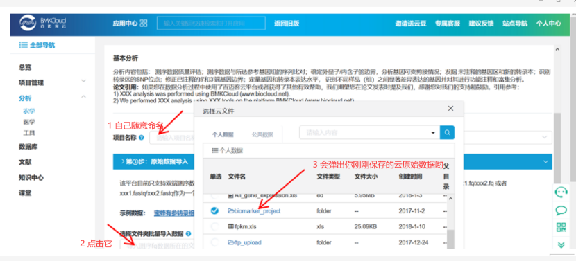 導入數據之后,可以根據自己的需要修改樣品ID,由于此處設置的ID會體現在分析報告和分析結果中,因此請慎重考慮后再設置,分析完成后不可再次修改。如果平臺上還沒有您自己的數據,請參考數據上傳先將您的數據傳到云平臺上。